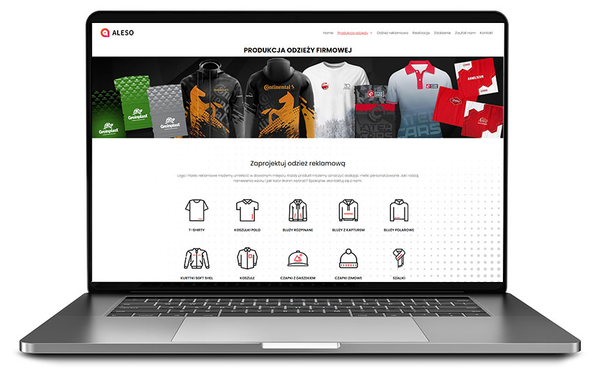 Strona internetowa dla ALESO to profesjonalna oprawa dla firmy zajmującej się sprzedażą i szyciem odzieży reklamowej. Kolorystyka spójna z koncepcją logo oraz elementy graficzne ściśle związane z branżą, w jakiej działa klient to podstawowe wyróżniki tej realizacji. Nowa strona internetowa to wiedza i oferta skondensowane w formie przyjaznej dla odbiorcy. Wszystkie informacje zostały odpowiednio pogrupowane, dzięki czemu teksty i grafiki nie przytłaczają potencjalnego Klienta.