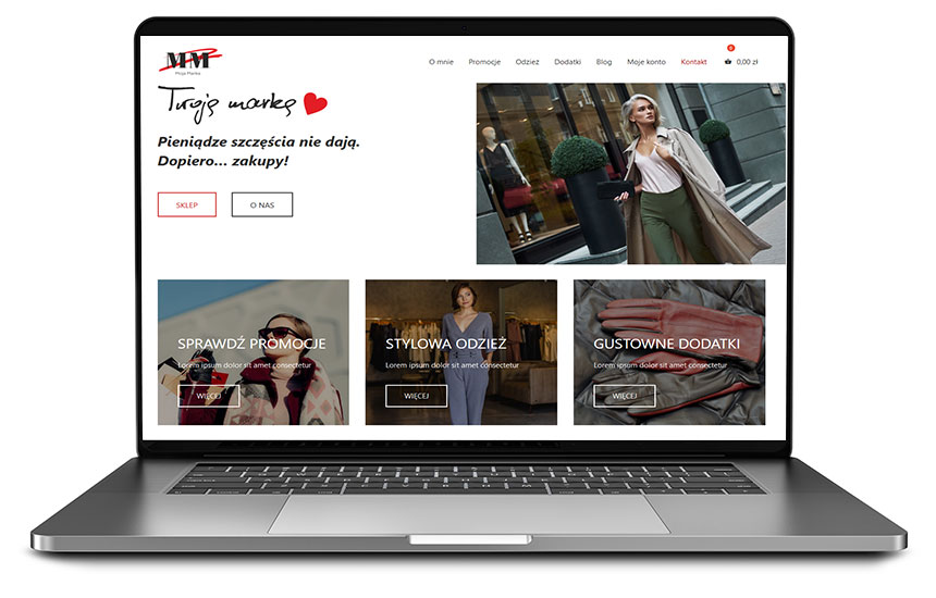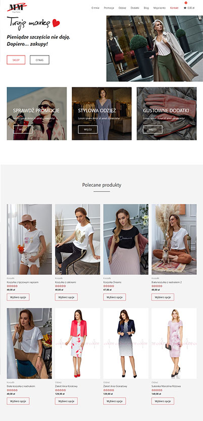 Dokładnie rozplanowana architektura sklepu internetowego, przyjazny układ treści oraz grafik, to elementy, które zachęcają do zapoznania się z całą ofertą. Potencjalny Klient błyskawicznie może dotrzeć do poszukiwanych produktów. Kolejnym strzałem w dziesiątkę okazało się podzielnie produktów z asortymentu sklepu internetowego na kategorie - dzięki temu jeszcze szybciej i łatwiej odnajduje się tu ubrania, które spełniają wymagania nawet najbardziej wymagających Klientów.